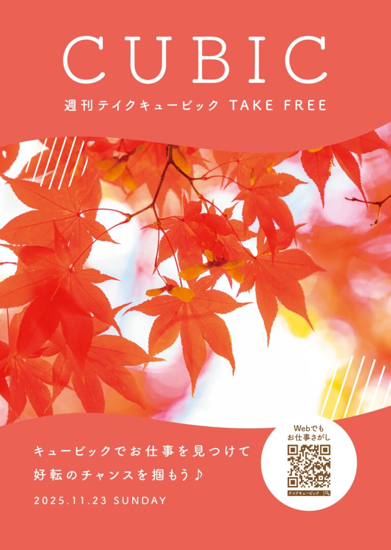 CUBIC[愛媛版] 11/23号 vol.1158が発刊されました! 2025/11/23 お知らせ 『週刊テイクキュービック[愛媛版]』11/23号が発刊されました。 是非本誌・WEBともに、お仕事探しにご利用ください♪ 掲載期間: 2025/12/8 前の記事