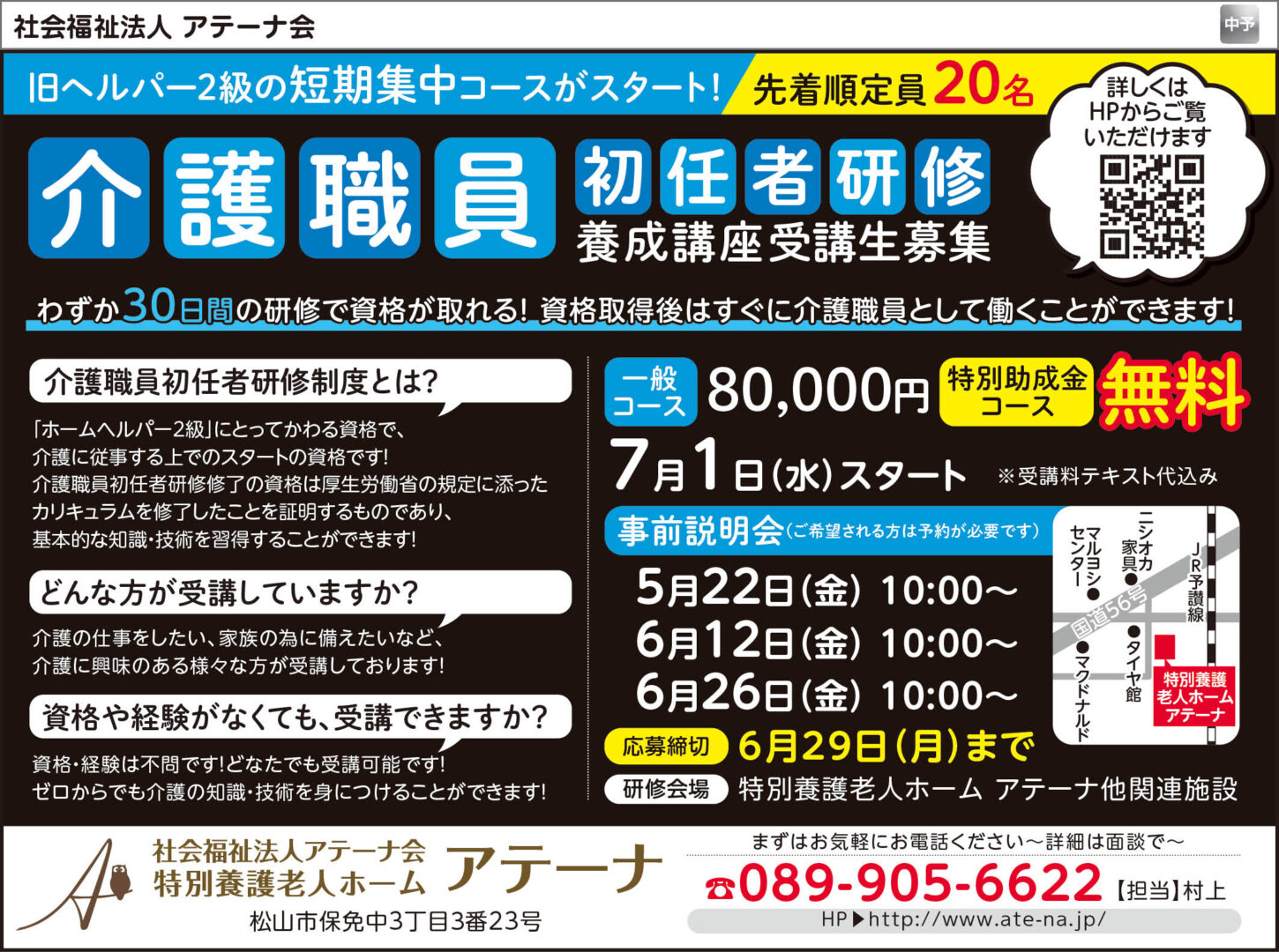 <特別養護老人ホーム アテーナ> 旧ヘルパー2級の短期集中コースがスタート! 介護職員初任者研修養成講座受講生募集 ★先着順定員20名★